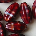 The term "tortoise" originally meant amber-colored beads with black stripes in them (like the beads on the left, below), but now it refers to any translucent bead with dark stripes. The stripes in tortoise beads are often horizontal, but not always. They should be in a somewhat parallel pattern and not be just random swirls. The green beads on the right have poorly formed stripes, but I still refer to them as tortoise beads.